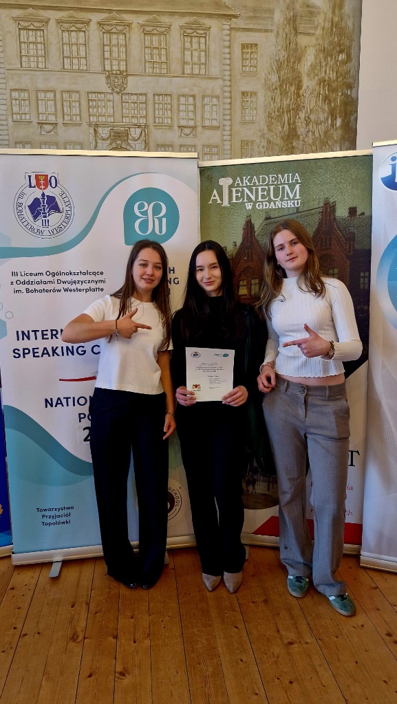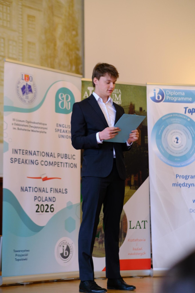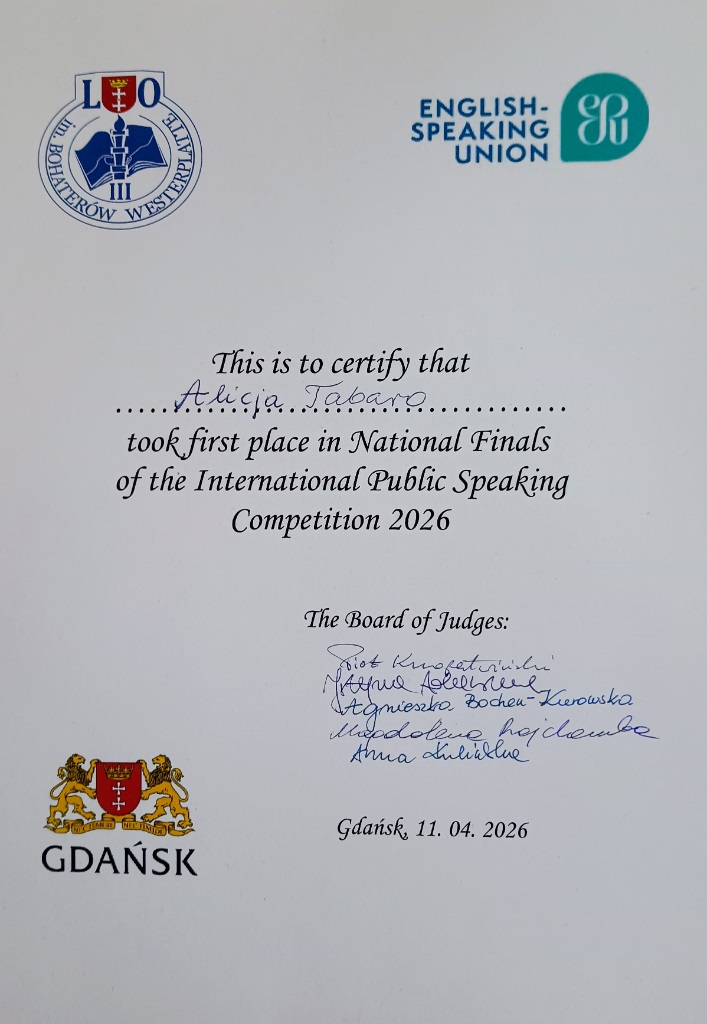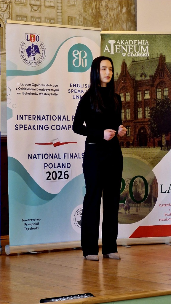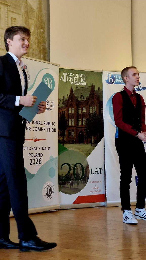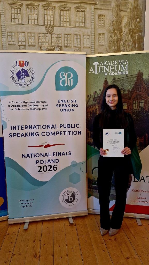 Z ogromną radością informujemy, że Alicja Tabaro z kl. 3IBa zwyciężyła w ogólnopolskim finale konkursu International Public Speaking Competition 2026, który odbył się 11 kwietnia w auli naszej szkoły. Ala będzie reprezentować nasz kraj w finale międzynarodowym w Londynie. Mistrzostwa Polski zorganizowały panie E. Gobis i B. Kardasińska z ogromną pomocą wolontariuszy z klas 3IBa i 1MYPa, dzięki którym impreza odbyła się bardzo sprawnie i zrobiła duże wrażenie na gościach i uczestnikach. Finał poprowadził nasz absolwent, Marcin Skiba, Mistrz Polski w Public Speaking sprzed dwóch lat. Dziękujemy Miastu Gdańsk, Akademii Ateneum w Gdańsku oraz Radzie Rodziców IIILO za sfinansowanie imprezy. Gratulujemy naszej mistrzyni oraz p. E. Gobis, która przygotowała ją do konkursu i trzymamy kciuki za Londyn.